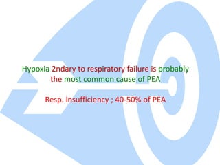 Respiratory failure leading to hypoxia is one of the most common causes of pulseless electrical activity responsible for about half of. One easy way to remember the most common causes of PEA as well as other cardiac emergencies is the Hs and Ts of ACLS. Hypovolemia toxins hypoxia thrombosis hypoglycemia thrombocytopenia hypothermia tamponade hydrogen ion tension pneumothorax hypokalemia hypothermia.