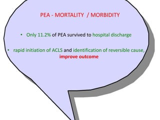 The Unique Case for PEA and Bradycardia in Pediatric Care. PEA formerly known as electromechanical dissociation occurs in patients who have organized cardiac electrical activity without a palpable pulse. A Provide effective CPR and correct the underlying cause of the rhythm.