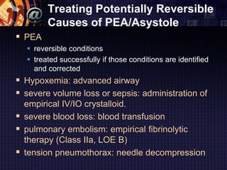 Treating the cause of hypoxiahypoxemia must be done quickly because this is one of the potentially reversible causes of cardiac arrest. See the Hs and Ts page for more information on the causes and treatment of PEA. They are also the most easily reversible and should be at the top of any differential diagnosis.